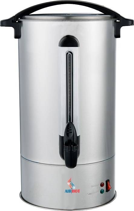 Электрокипятильник AirhotWBA-10— профессиональное настольное оборудование для кипячения воды в больших объёмах. Данная модель наливного типа, актуальна для столовых самообслуживания, кейтеринга, небольших баров, мобильных уличных точек питания, фуд-траков, где нет возможности подключения к водоснабжению. В бак вода заливается вручную. По объёму бака, представленный водонагреватель наилучшим образом подойдёт для заведений питания на 30 посадочных мест.
