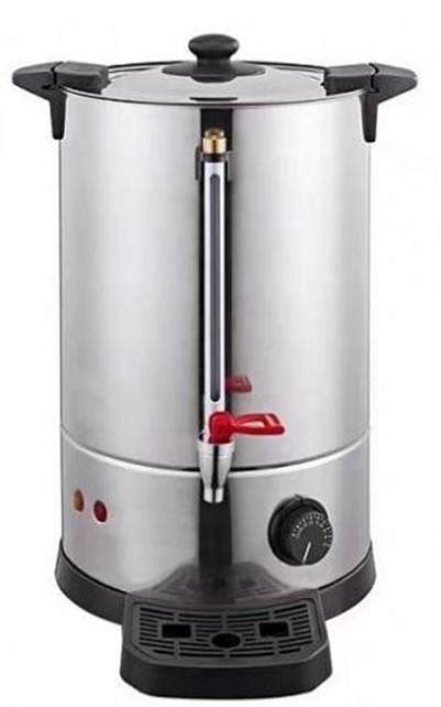 Удобен в использовании особенно при отсутствии центрального водоснабжения. Двойные стенки прибора имеют термоизоляцию. Наполнение ёмкости непременно должно быть, более половины её объема. Для предотвращения опрокидывания нужно устанавливать на ровную поверхность. Удобные ручки для перемещения расположены на корпусе кипятильника. Регулировка температуры нагрева воды от +30 до +110С. Рабочая мощность 2 кВт.