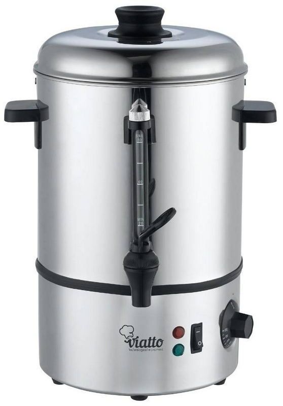 Viatto VA-WB08SSпредставляет собой кипятильник заливного типа объемом 8 литров. Аппарат предназначен для оборудования пунктов общественного питания (кафе с системой самообслуживания, заведений по продаже фаст-фуда, столовых), торговых точек. Модель позволяет подогреть, вскипятить, поддерживать в горячем виду воду. На корпусе установлен регулятор, который позволяет задать температуру нагрева от 30 до 100 градусов. Изделие выполнено из прочной нержавеющей стали. Материал отличается высокой надежностью, устойчив к коррозии не влияет на вкус воды. Для удобства использования на корпусе установлено окошко с мерной шкалой для контроля уровня воды, термоизолированные ручки для переноски. Розлив воды осуществляется через краник.