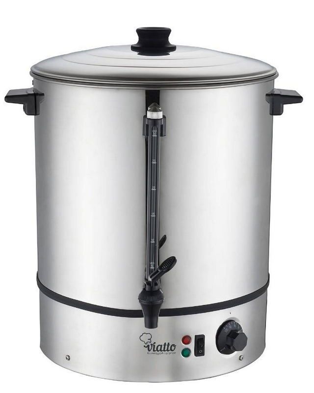 Viatto VA-WB30SSпредставляет собой заливной кипятильник объемом 30 литров. Модель отлично подходит для оборудования столовых, заведениях по продаже фаст-фуда, кафе с системой самообслуживания. Аппарат предназначен для кипячения, нагрева до заданной температуры и поддержания в горячем виде воды. На корпусе установлен поворотный терморегулятор, позволяющий задать нагрев в диапазоне от 30 до 100 градусов. Для удобства использования кипятильник оснащен окошком с мерной шкалой для контроля уровня воды, термоизолированными ручками для переноски. Корпус модели выполнен из прочной нержавеющей стали. Аппарат выполнен из прочной нержавеющей стали. Металл отличается устойчивостью к коррозии, не влияет на вкус воды.