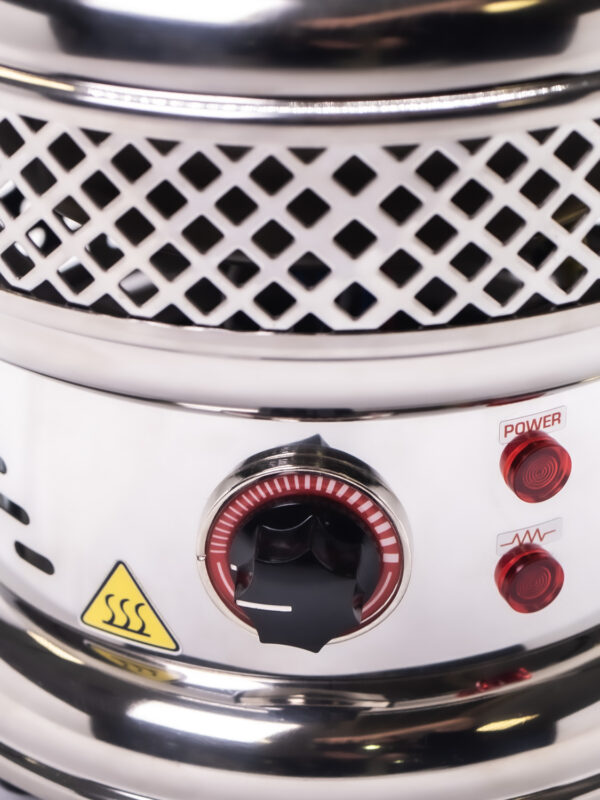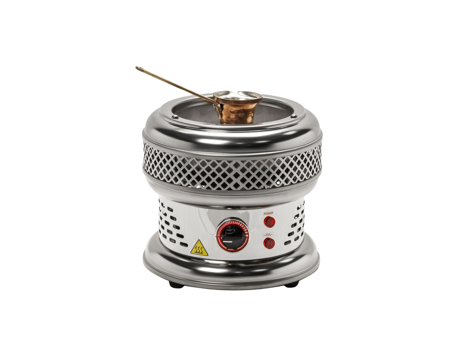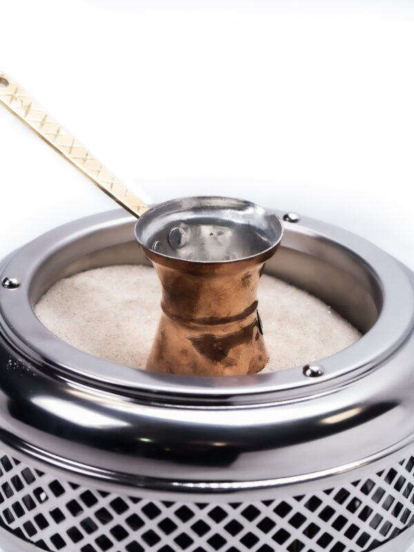 Johny AK/8-5 хромпредставляет собой аппарат для приготовления кофе на песке. Модель рассчитана на применение в профессиональных кофейнях, она позволяет готовить кофе по-восточному. Принцип прост: с помощью ТЭНов песок нагревается до нужной температуры. В него устанавливается джезва с водой и молотым кофе. Нагретый песок равномерно нагревает турку, обеспечивая оптимальную экстракцию. В конструкции применяется нагревательный элемент из алюминия.