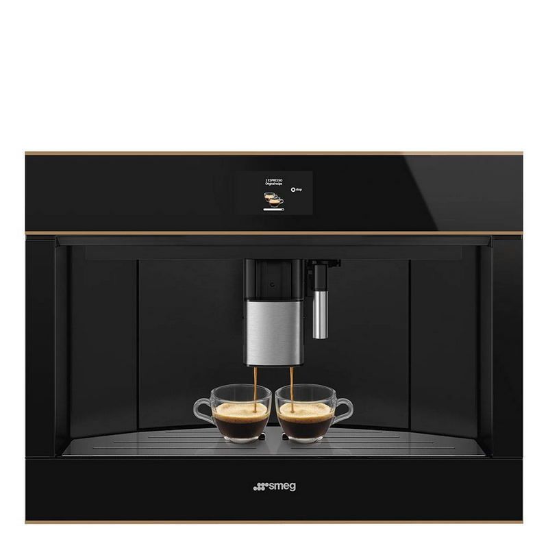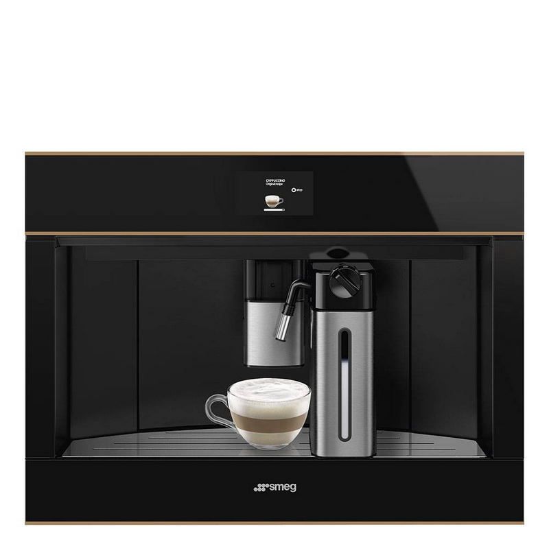 SMEG CMS4604NRRUпредставляет собой встраиваемую кофемашину. Модель относится к серии Dolce Stil Novo, модель выполнена в черном цвете с медным профилем. В устройстве применяется система сенсорного управления с TFT дисплеем размером 4.3 дюйма с возможность блокировки. В конструкции предусмотрен резервуар для воды объемом 2.5 литра. Встроенная кофемолка оснащена резервуаром на 350 г, также предусмотрена емкость для сбора молотого кофе. Дополнительно предусмотрены индикаторы и заполнении резервуаров для отходов, поддон-каплесборник. Уход за аппаратом серьезно упрощает система ополаскивания и удаления накипи в автоматическом режиме.