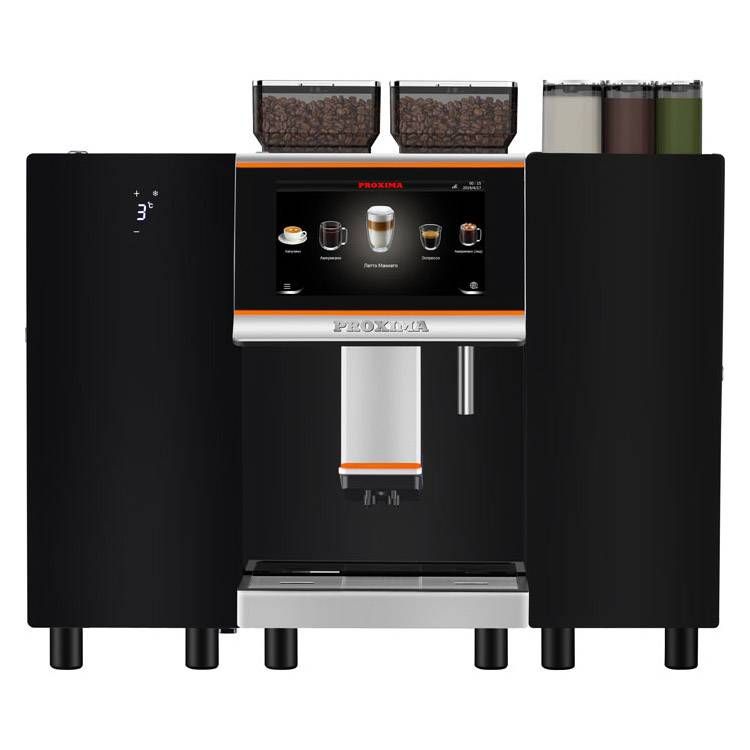 Dr.coffee PROXIMA F22представляет собой кофемашину, предназначенную для оснащения торговых точек, пунктов общественного питания. Аппарат позволяет готовить в автоматическом режиме 24 разных напитка, в том числе американо, капучино, горячего шоколада, латте, эспрессо, флэт вайт. Также возможна подача горячей воды, молока, взбивание холодной и горячей молочной. Кофемашина оснащена встроенной кофемолкой с двумя плоскими жерновами. Также предусмотрен клапан промывки молочной системы, который значительно упрощает процесс обслуживания аппарата. Для управления установлен сенсорный экран с интерфейсом, понятным на интуитивном уровне. Корпус, каплесборник и контейнер сбора отработанного кофе выполнены из пластика. В кофемолке установлены керамические жернова. Трубка подачи воды, заварное устройство со съемной конструкцией выполнены из металла.
