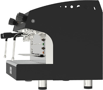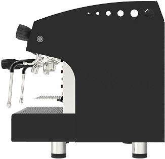 Корпус кофемашины изготовлен из нержавеющей стали: внешний контур – из окрашенной в черный цвет, внутренний – из полированной. Прибор оборудован широкими устойчивыми ножками, сверху предусмотрена подогреваемая полка для чистых чашек. В зоне кофейных групп находятся трубка подачи кипятка и 2 трубки пара, манометры бойлера и помпы, кнопка пуска и световые индикаторы работы прибора. На передней стенке корпуса установлены регуляторы пара (2 шт.) и горячей воды, отдельные кнопки с подсветкой для включения/выключения каждой из групп. Прибор рассчитан на налив кофе в высокие стаканы, для классических кофейных чашек предназначены 2 откидные решетчатые полочки.
