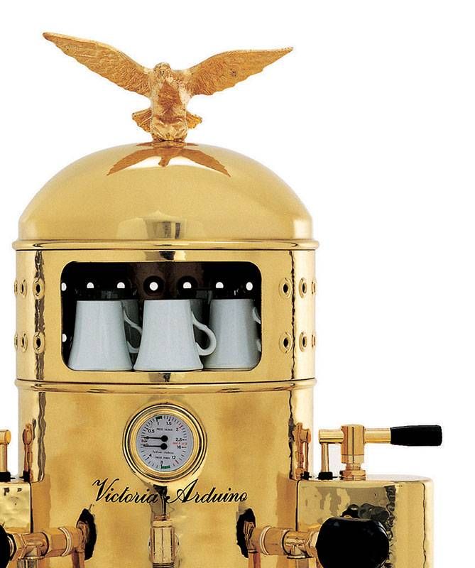 Вертикальный корпус украшен сверху орлом с раскинутыми крыльями. Под самым «куполом» расположен подогреватель для чашек. Это автоматическая кофемашина, осуществляющая автодозацию, подачу пара/кипятка, программирование объемов воды на порцию, автоуровень воды.