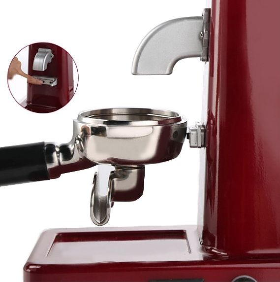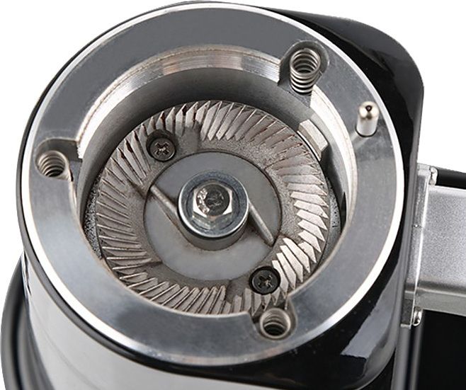 В конструкции предусмотрен бункер для зернового кофе вместимостью 500 г. Присутствует гибкая система регулировки степени помола. Молотый кофе подается в холдер. Включается кофемолка путем нажатия холдером на микрокнопку.