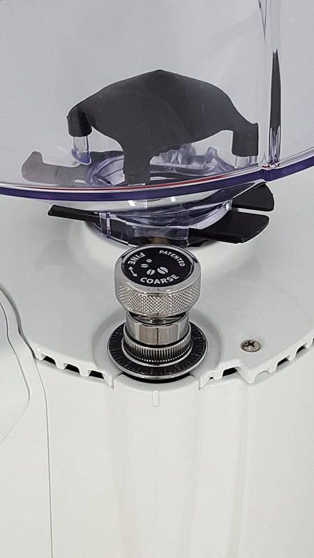 - прозрачный пластиковый контейнер для кофейных зерен с устройством для постепенного просыпания продукта на жернова;