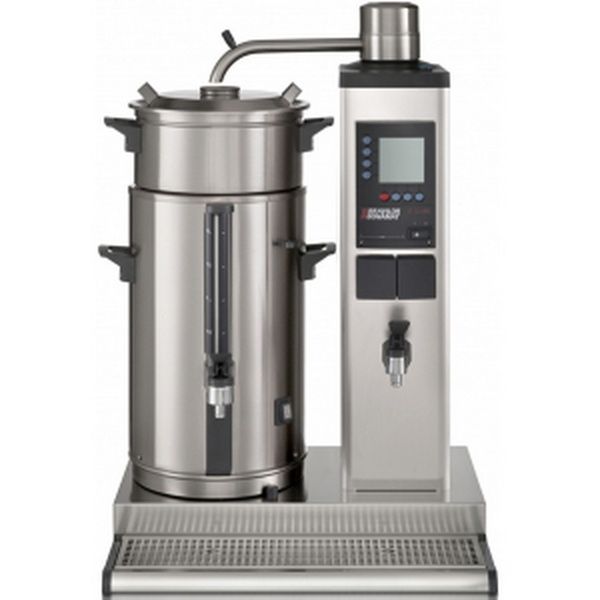 Кофеварка BRAVILOR BONAMAT B10 HW L— кофемашина фильтрационная с подключением к холодной воде (3/4″) оснащена 1 контейнером VHG слева, бойлером для кипятка на 3,3л, цифровым дисплеем, сигналом «кофе готов», счетчиками порций: за день и их общего количества, встроенным таймером, системой удаления накипи и каплесборником. Кофемашина подходит для мест, где в моменты сверхнагрузки требуется большое количество кофе. Для подачи кипятка предусмотрен отдельный кран. Кофе заваривается в больших количествах в любое время, далее напиток наливается в контейнер. Контейнер затем можно перемещать и сервировать кофе в разных местах.