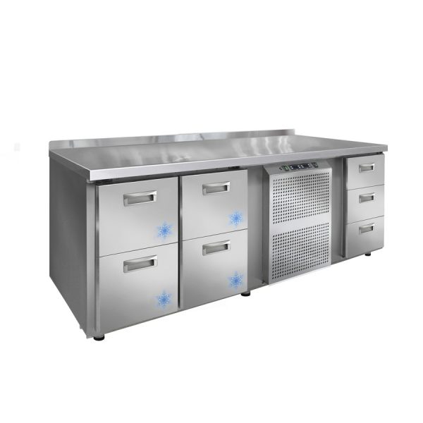 Холодильно-морозильный стол Финист с независимыми объемами. В отличие от стандартных комбинированных столов, в которых холодильная и морозильная секции объединены, в столах КХС эти объемы стали независимыми. Обе камеры охлаждаются до необходимой температуры независимо друг от друга, что ползволяет соблюдать правила товарного соседства. Столы комплектуется двумя пультами управления для регулировки температуры в секциях. При этом при выключении охлаждения в одной камере, вторая продолжает функционировать.