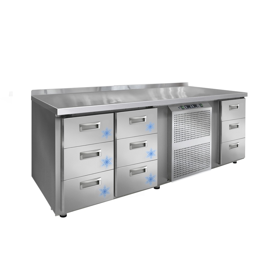 Холодильно-морозильный стол Финист с независимыми объемами. В отличие от стандартных комбинированных столов, в которых холодильная и морозильная секции объединены, в столах КХС эти объемы стали независимыми. Обе камеры охлаждаются до необходимой температуры независимо друг от друга, что ползволяет соблюдать правила товарного соседства. Столы комплектуется двумя пультами управления для регулировки температуры в секциях. При этом при выключении охлаждения в одной камере, вторая продолжает функционировать.
