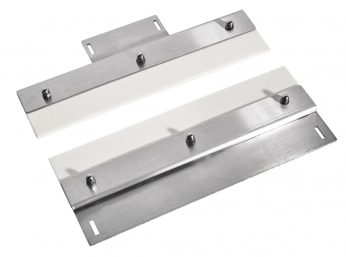 В комплект включены два скребка с прямыми кромками и один с округлой. Скребки представляют собой нержавеющие пластины, между которыми болтами закреплена силиконовая вставка.