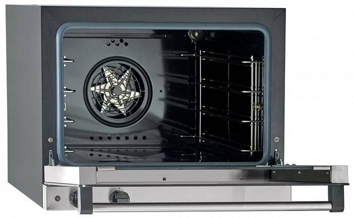 Abat КПП-4ЭМпредставляет собой конвекционную печь, она предназначена для приготовления различных блюд, выпечки хлебобулочных и кондитерских изделий, а также разогрева. Термическая обработка происходит за счет подачи горячего воздуха и его циркуляции. Она происходит посредством встроенного вентилятора. Пользователь может задать температуру нагрева от 20 до 270 град. Регулировка осуществляется за счет механической панели управления.