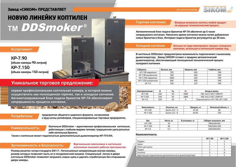 Коптильная камера СикомКР-7.90– профессиональное коптильное оборудование новой линии производственных моделей ТМ DDSmoker. Установка аппарата на столешницу из коррозионностойкой стали в специальных помещениях заведений питания или в производственных цехах специализированных торговых точек.