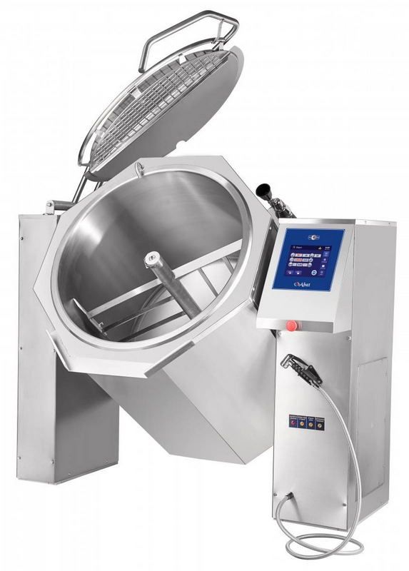 Abat КПЭМ-350-ОМПс миксером предназначен для кипячения воды, приготовления бульонов, супов, соусов, кремов, каш, омлетов, плова, рагу, карри, пюре и других блюд и напитков на предприятиях общественного питания и пищевой промышленности крупного формата. Благодаря усиленной конструкции миксера, плавной регулировке скорости и функции реверса может быть использован для взбивания и перемешивания практически любых продуктов. Нагрев воды производится способом «пароводяной рубашки». Оснащён откидной крышкой, которая может быть зафиксирована в верхнем положении. В аппарате предусмотрена функция нагрева от 3 до 110 градусов, охлаждения от 110 до 3 градусов и 50 пользовательских программ, в каждой из которых предусмотрено до 5 этапов. Охлаждение блюда достигается за счет создания пароводяной рубашки с проточной холодной водой. Оператор может задать скорость вращения миксера в каждую сторону, длительность паузы, предусмотрено несколько режимов работы смесителя. Готовый продукт сливается путем опрокидывания.