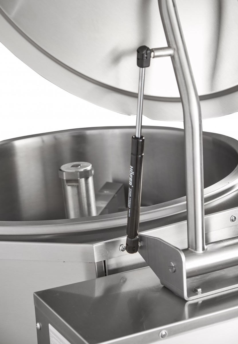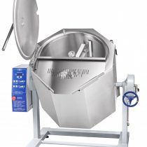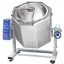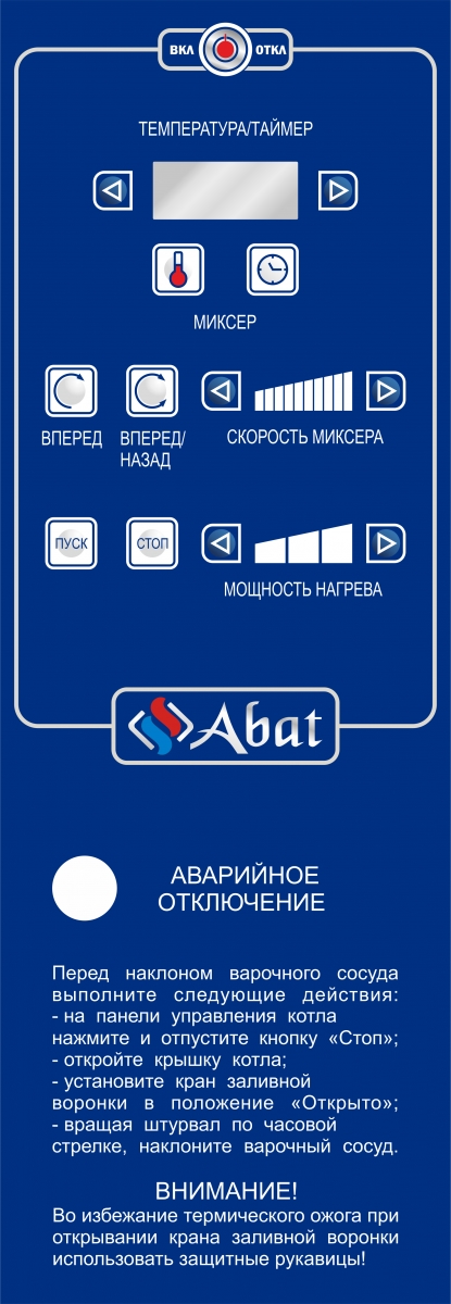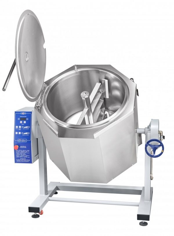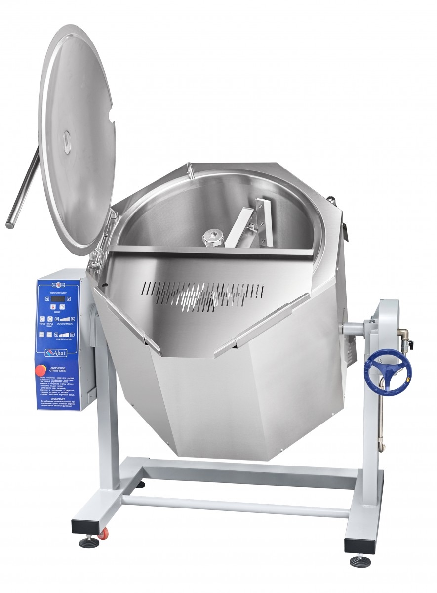 На станине слева смонтирован электронный блок управления с мембранной клавиатурой. Справа расположен штурвал и механизм опрокидывания котла. Кран залива воды в варочный сосуд находится сверху.