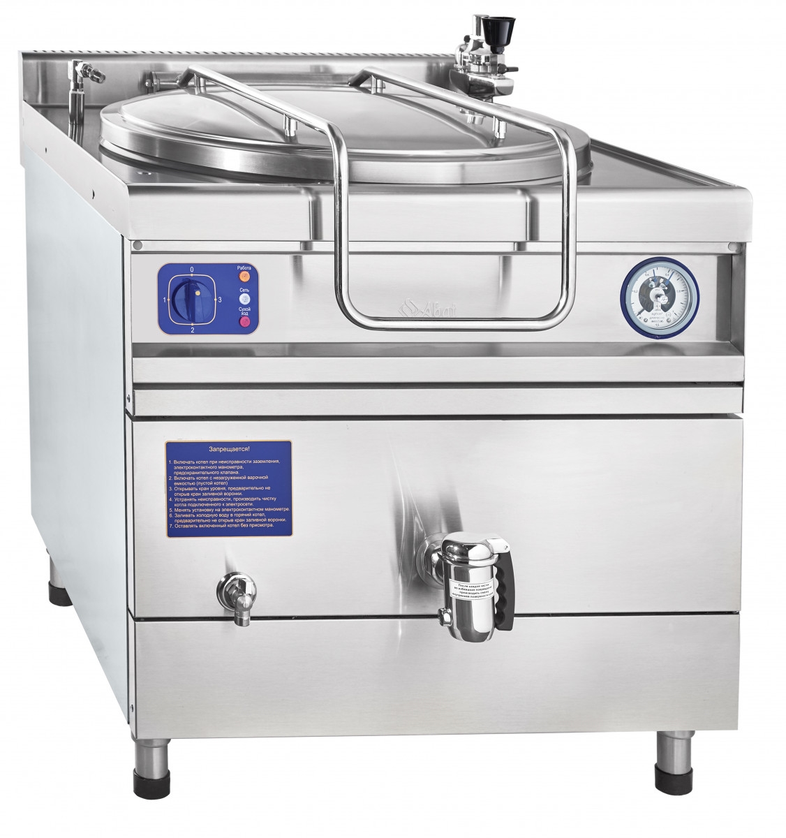 Пища в котле не пригорает, т. к. готовится по принципу водяной рубашки, вода в которой нагревается двумя блоками по 3 ТЭНа в каждом. На столешнице, кроме крышки, расположены краны залива воды в котел и рубашку. Спереди на корпусе находятся краны слива пищи и воды из рубашки, манометр, переключатель режимов и индикаторы работы.