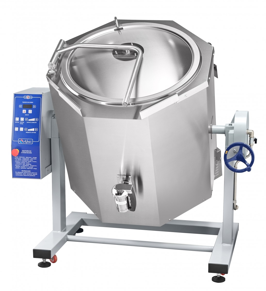 Для управления котлом на левой стороне станины предусмотрена электронная панель с мембранной клавиатурой. Механизм ручного опрокидывания со штурвалом находится справа.