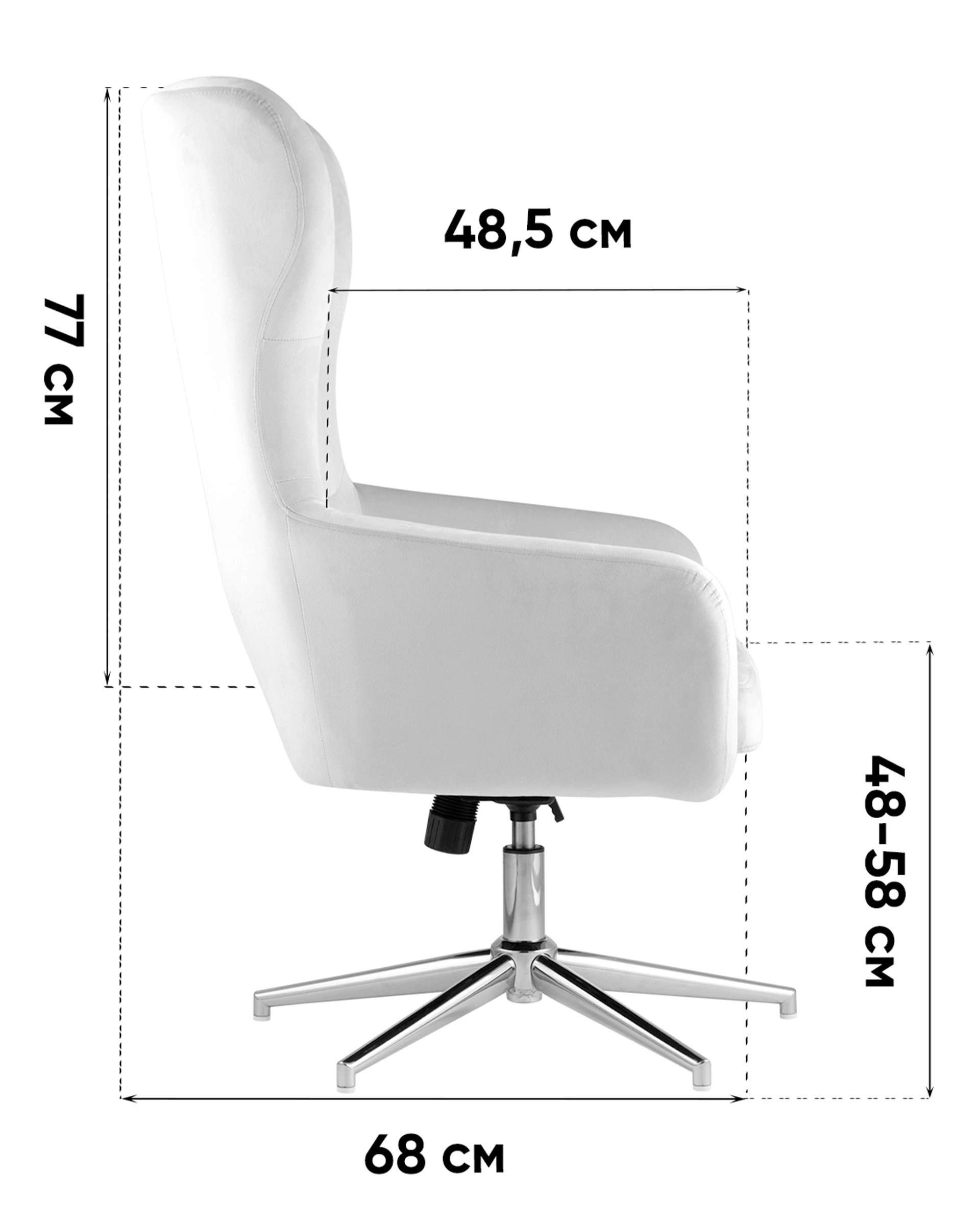 Широкое кресло с удобной высокой спинкой на крепком металлическом каркасе. Регулировка по высоте. Обивка выполнена из мягкого износостойкого велюра. Нагрузка до 120 кг. Высота сиденья регулируется от 48 до 58 см. В зависимости от регулировки общей высоты кресла, высота подлокотников от пола составляет 63-73 см.