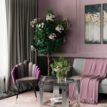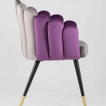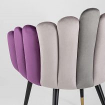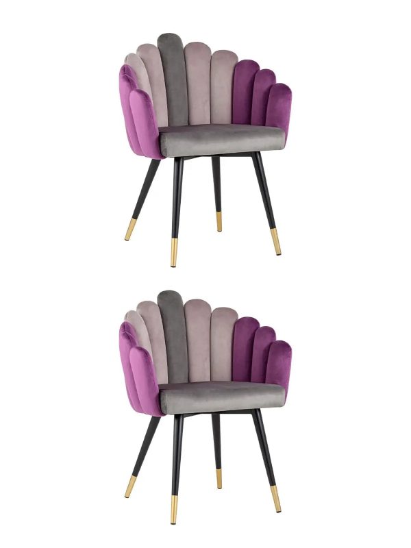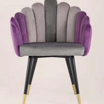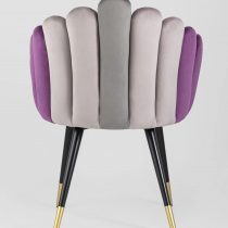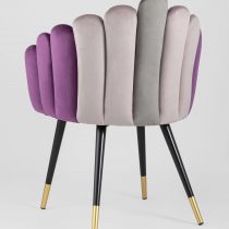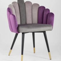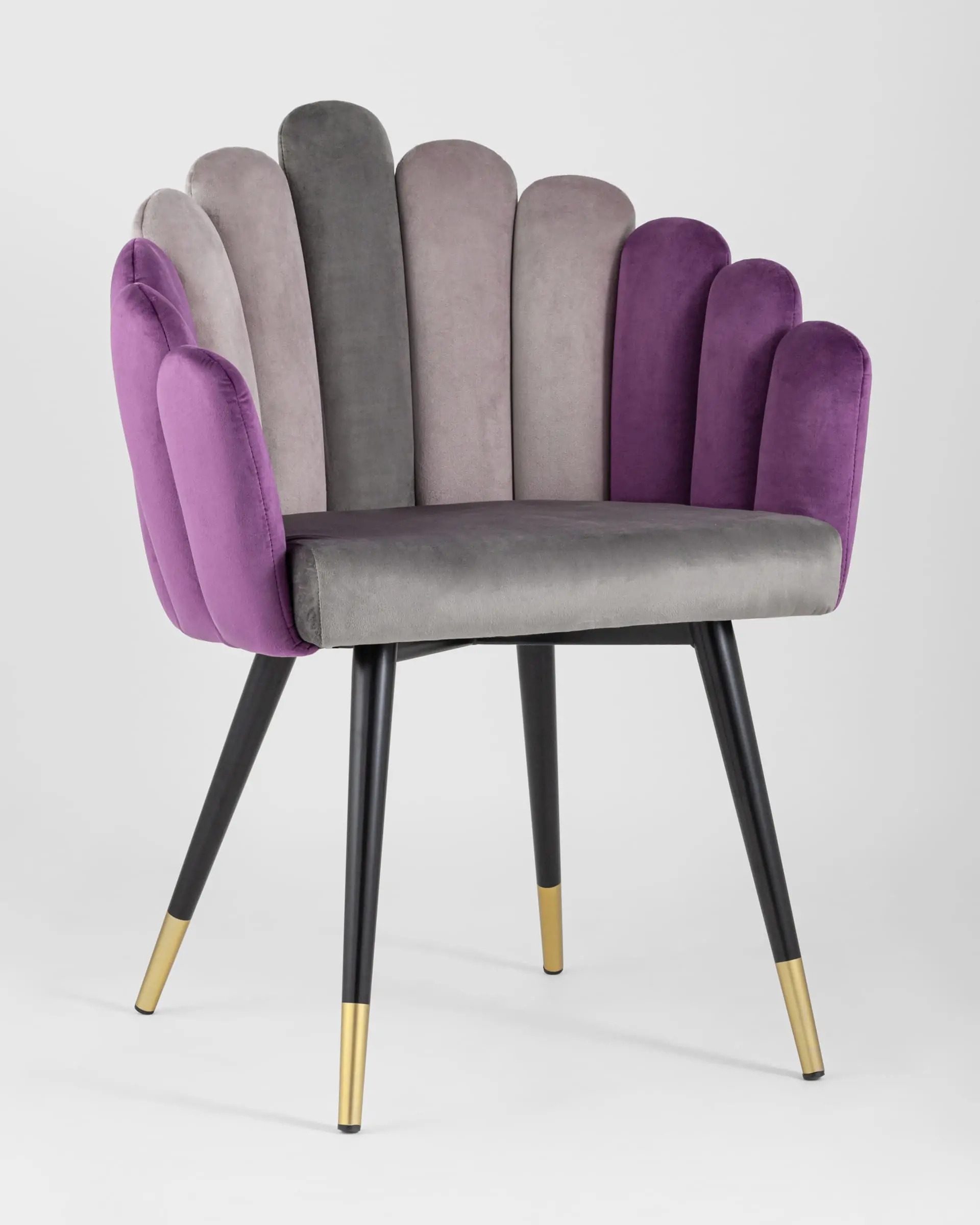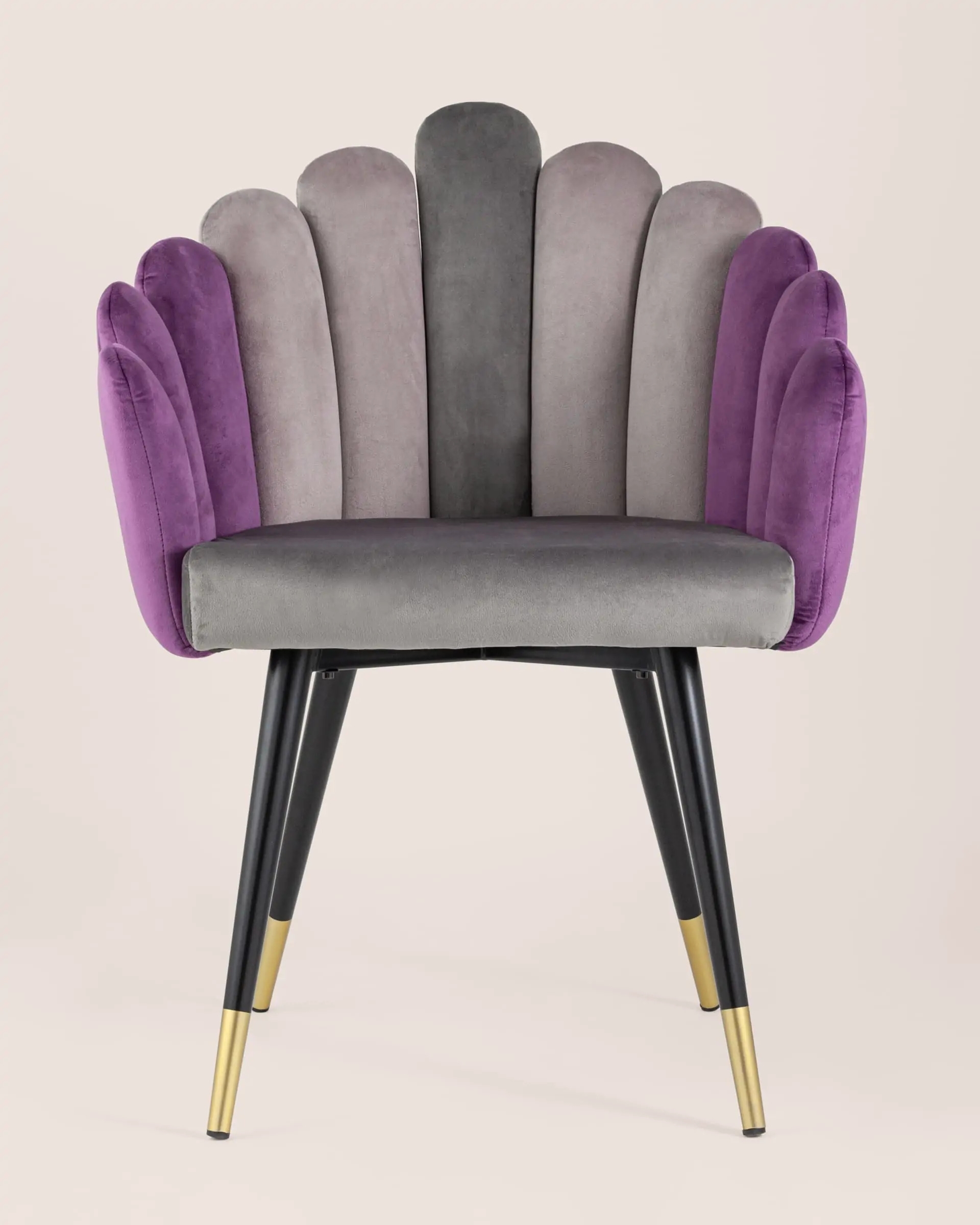 Яркое многоцветное кресло с обивкой из прочного велюра. Надежная опора достигается благодаря металлическому каркасу и удобным устойчивым ножкам с золотым декором. Спинка с оригинальным дизайном украшена широкими полосами в виде веера.
