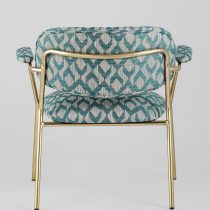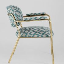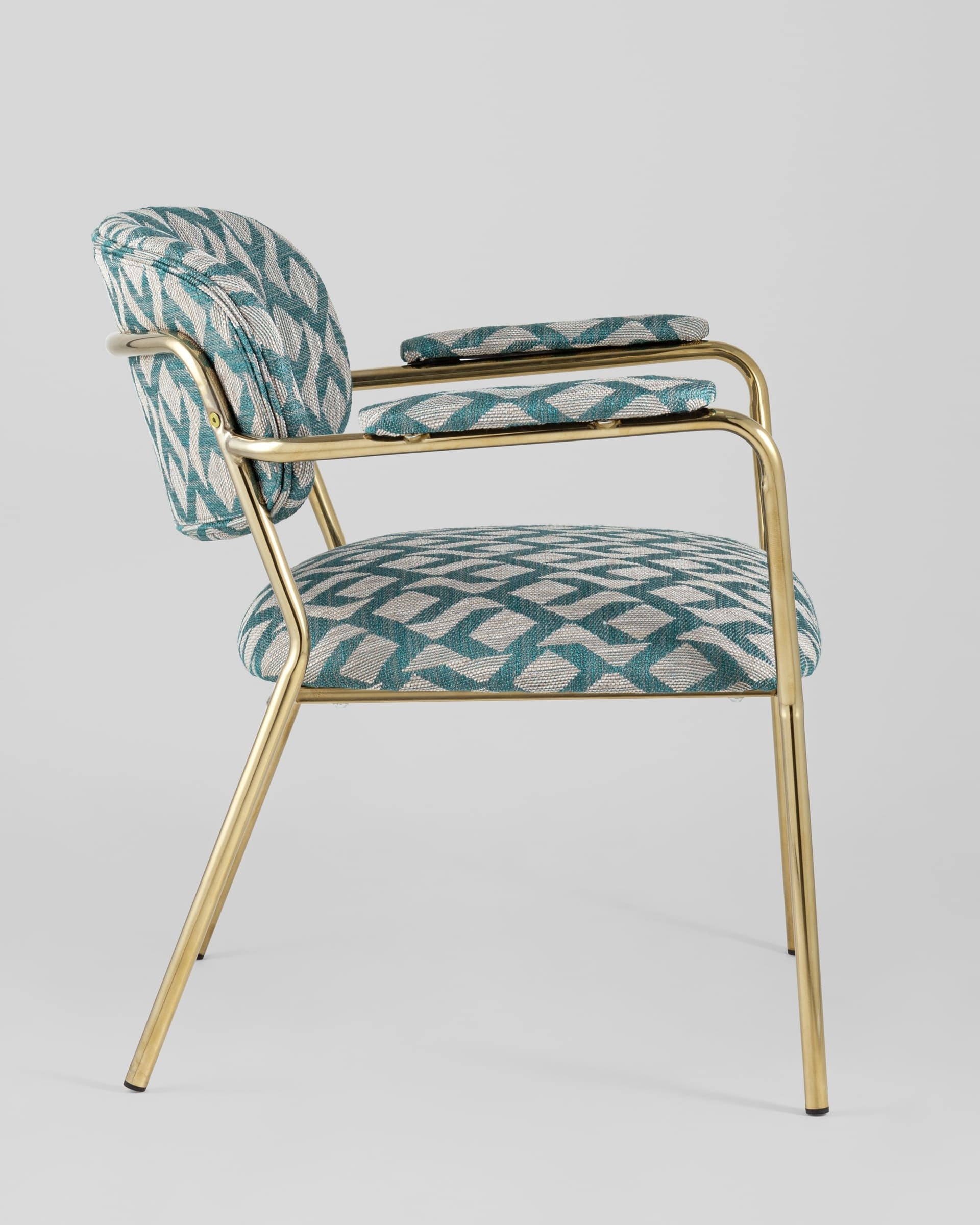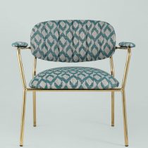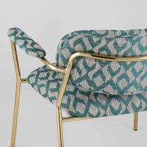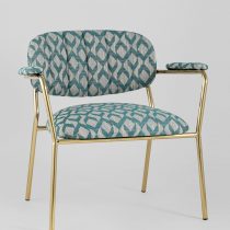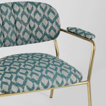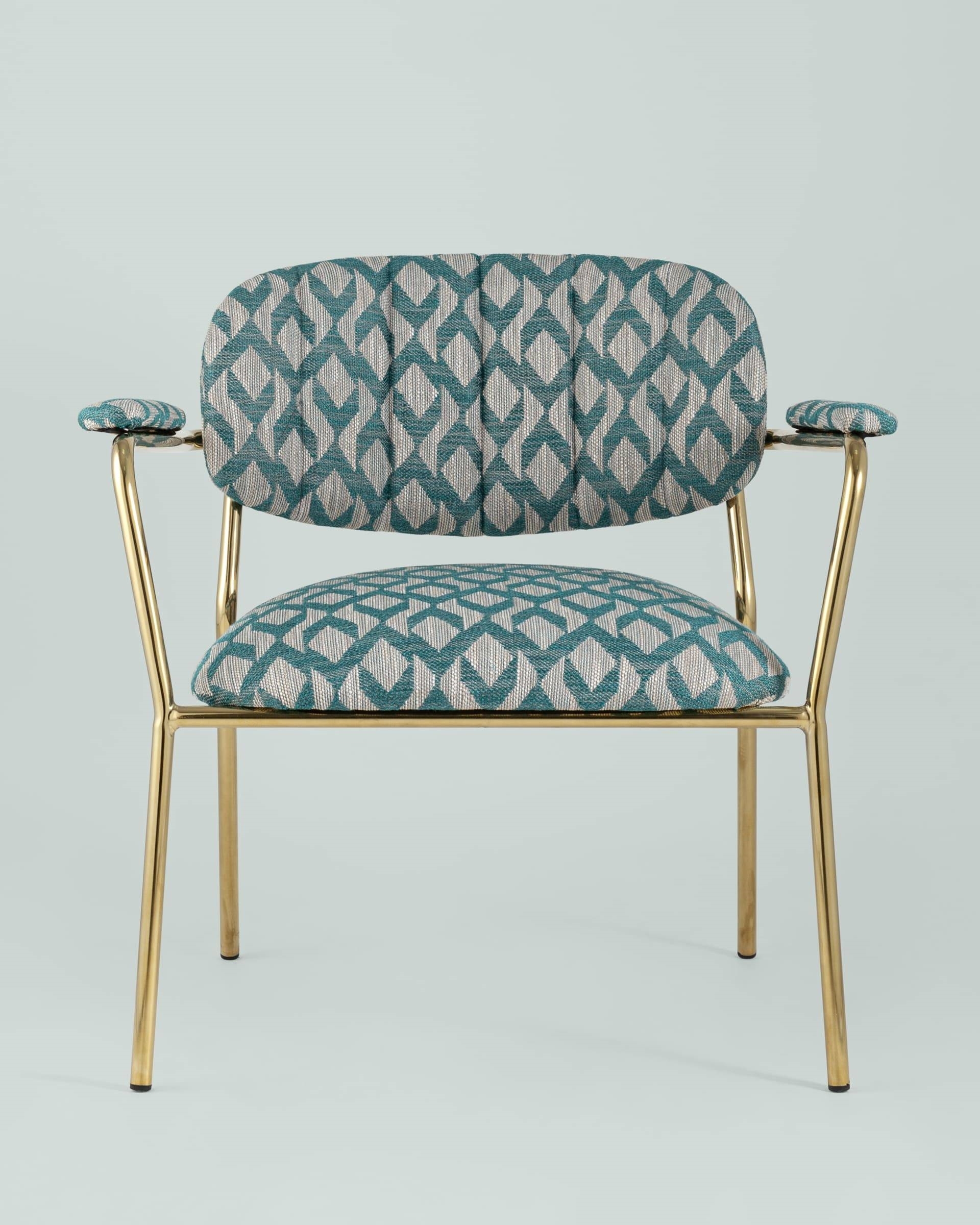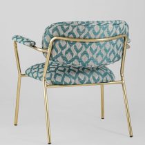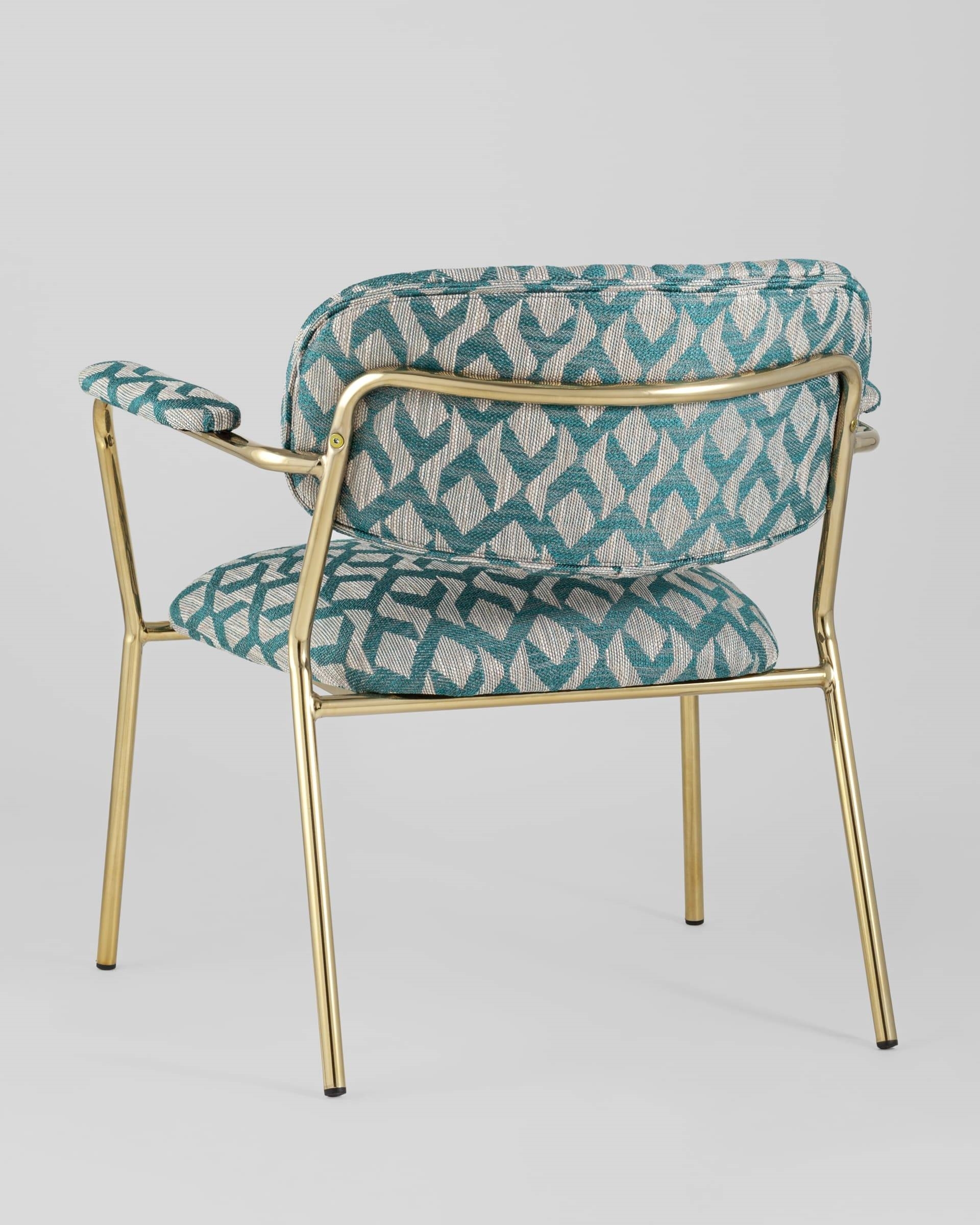 Современное кресло с подлокотниками и металлическими ножками. Обивка выполнена из плотной ткани с орнаментом. Металлический каркас золотого цвета огибает спинку и плавно переходит из подлокотников в ножки. Широкое сиденье обеспечивает удобную посадку и уют. На подлокотниках для дополнительного комфорта предусмотрены мягкие накладки. Высота подлокотников от пола составляет 57,5 см.