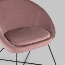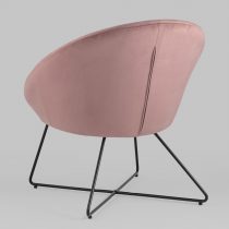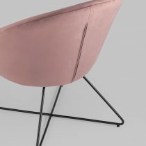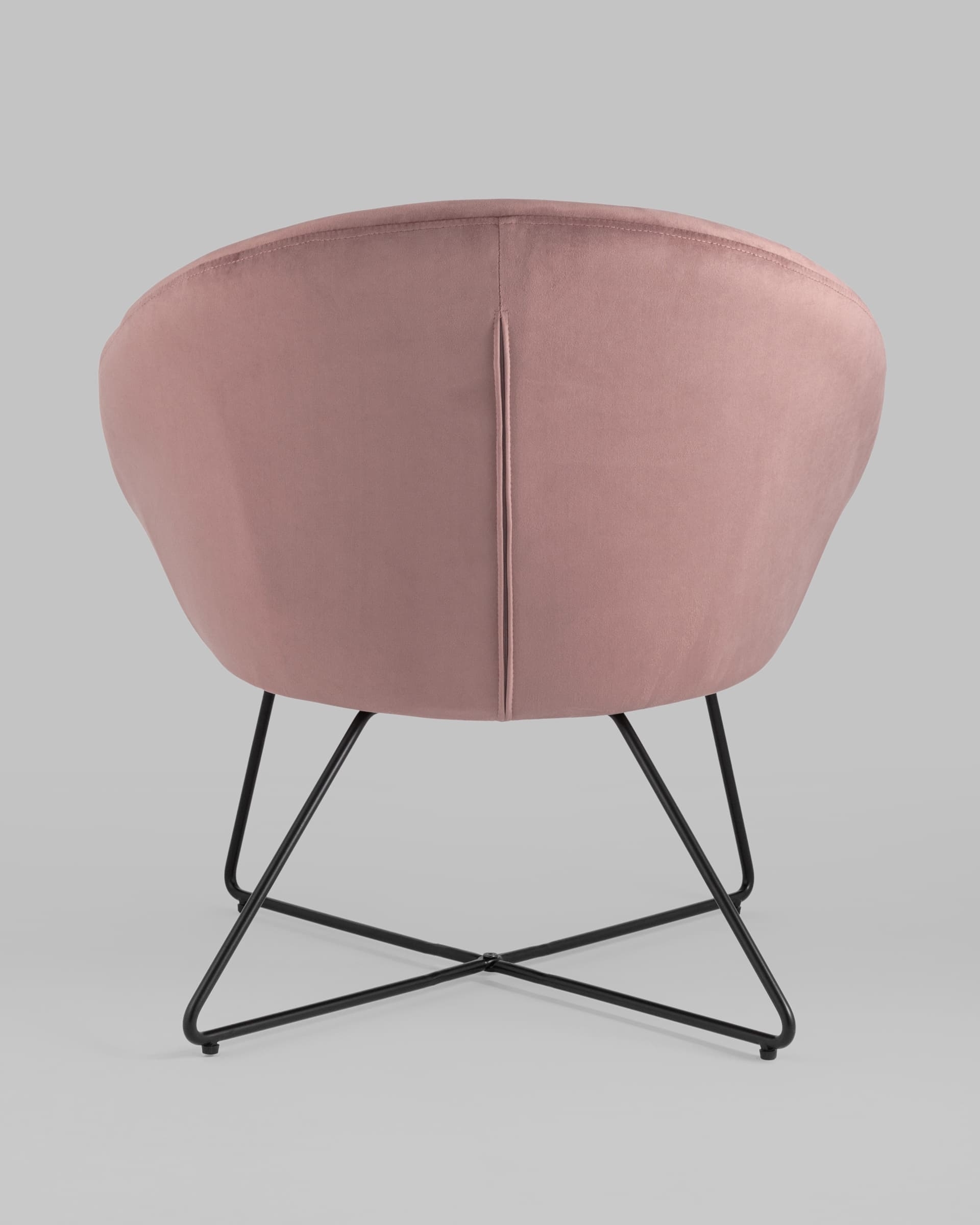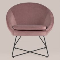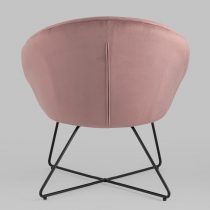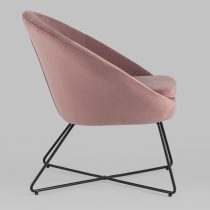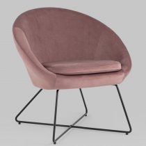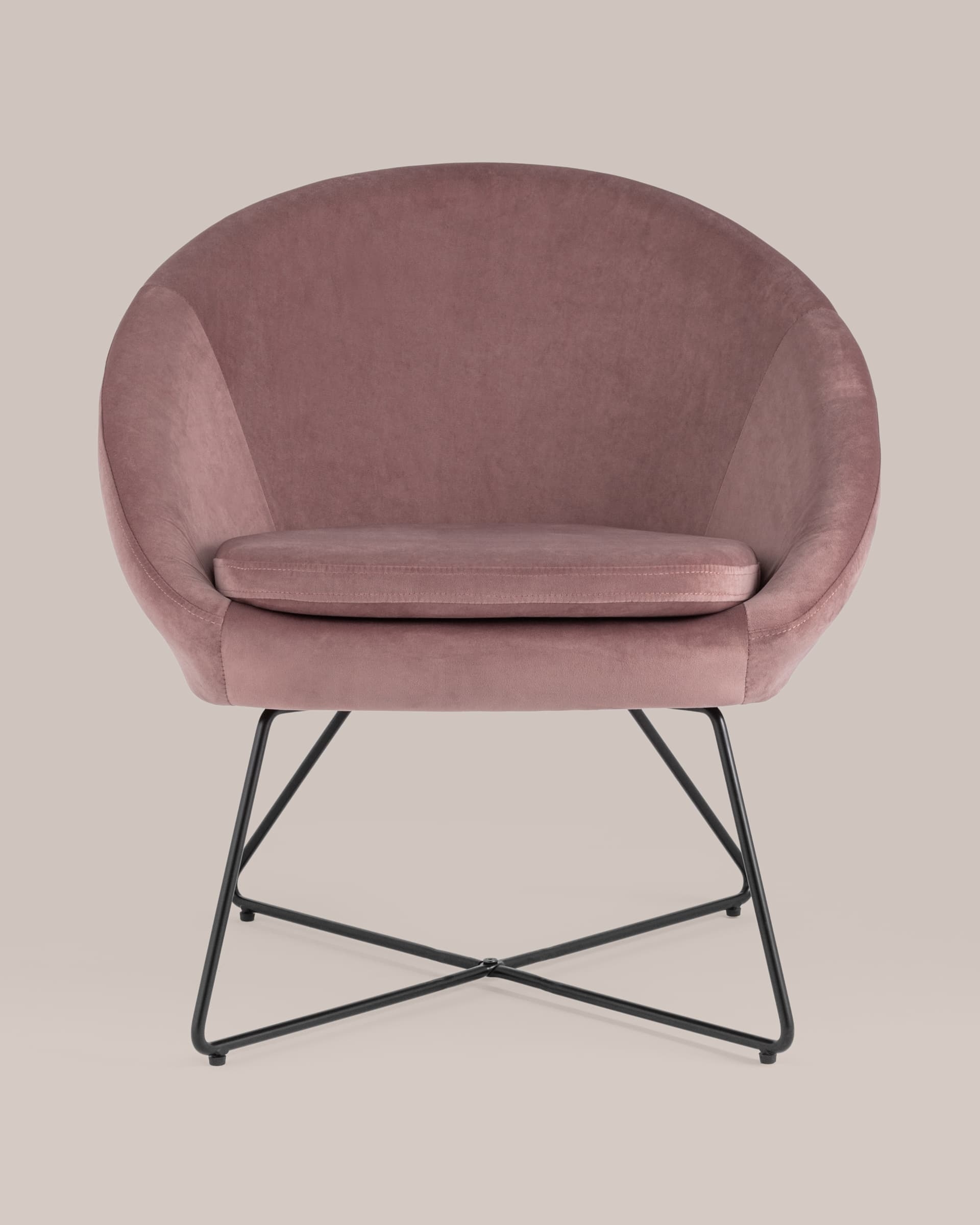 Широкая спинка плавно переходит в удобные подлокотники. Перекрещенные ножки изготовлены из металла и добавляют креслу оригинальности. Для дополнительного комфорта в кресле есть мягкое плотное сиденье. В качестве обивки используется велюр, приятный на ощупь. Металлический каркас добавляет устойчивости и выдерживает нагрузку до 120 кг.