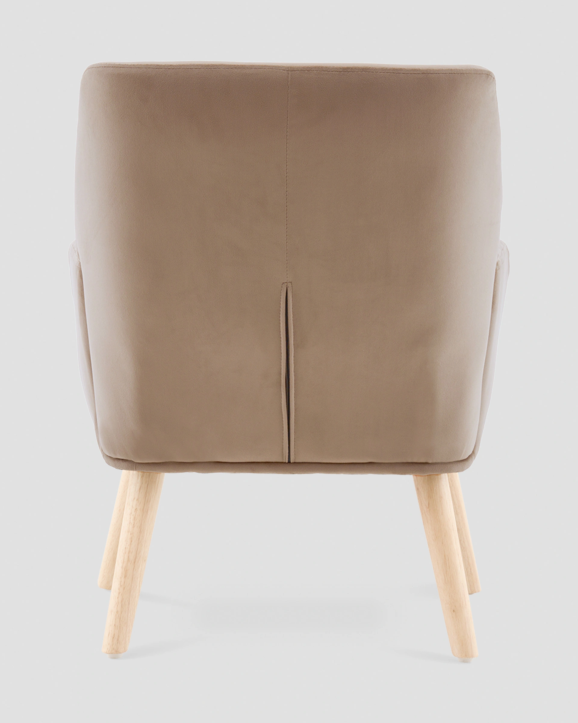 Обивка выполнена из прочного и приятного на ощупь велюра, который легко очищается и сохраняет насыщенность цвета. Ножки — из массива гевеи, окрашены в натуральный оттенок светлого дерева. Конструкция выдерживает до 120 кг.
