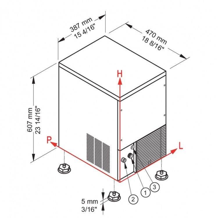 Льдогенератор управляется с фронтальной панели корпуса кнопкой пуска. На тыльной стороне находятся точки подключения к системе холодного водоснабжения и канализации, тумблер питания и сетевой кабель.