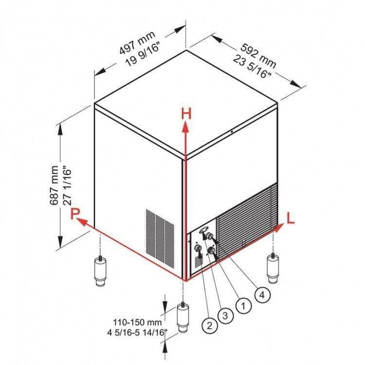 Льдогенератор выполнен в виде прямоугольного корпуса из нержавеющей стали, стоящего на высоких стальных ножках с возможностью регулировки по высоте. В верхней части корпуса расположены механизм льдообразования и бункер для готового льда. Изолированная крышка бункера при открывании прячется под верх. Холодильный агрегат на базе компрессора находится под бункером. За счет водяного охлаждения конденсатора агрегата льдогенератор можно устанавливать вплотную к стенам и другому оборудованию.