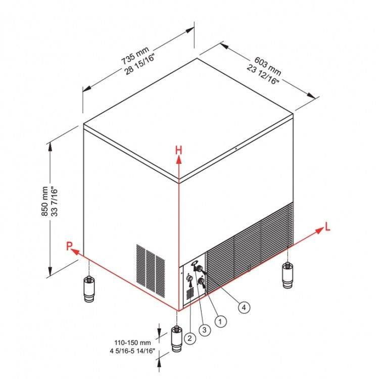 Стальной нержавеющий корпус льдогенератора имеет прямоугольные очертания и стоит на высоких ножках с регулировкой. Механизм льдообразования и бункер для готового льда расположены в верхней части корпуса. Скругленные углы бункера позволяют быстро и легко его чистить, его изолированная крышка при открывании прячется под верх. В нижнем отсеке корпуса установлен холодильный агрегат на базе компрессора, охлаждение его конденсатора производится воздухом. Для обеспечения притока и оттока воздуха от вентилятора на корпусе предусмотрены решетки. При установке устройства на полу необходимо оставлять зазоры от стен и других приборов.