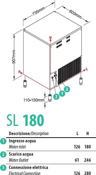 ЛьдогенераторNTF SL 180 A– итальянское напольное оборудование для производства льда для охлаждения любых напитков, в том числе коктейлей или минеральной воды, быстрого охлаждения большого объема жидкости для пищевого производства. Форма производимого продукта – Dice или кубик с небольшим утолщением в верхней части. Модель с компактными габаритами и может устанавливаться под столешницу/барную стойку.
