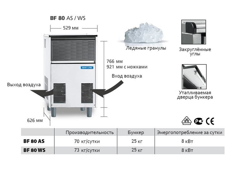 Льдогенератор SCOTSMANBar line BF 80 WSпредназначен для производства гранулированного чешуйчатого льда. Он рассчитан на установку в небольших и средних заведениях общепита (барах, кафетериях, кафе) и используется для охлаждения салатов, холодных закусок, десертов. Он также необходим в торговле для выкладки на открытых витринах мяса, рыбы и морепродуктов, на пищевом производстве для приготовления теста и фарша.