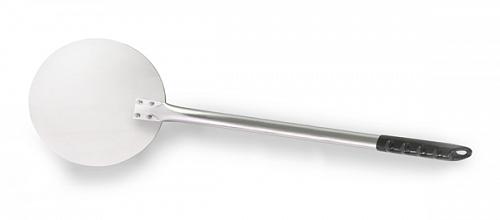 Рабочая поверхность диаметром 12 дюймов подходит для работы с пиццей стандартного размера. Общая длина лопаты составляет 1290 мм. Корпус выполнен из прочного алюминия. Металл прекрасно выдерживает высокие нагрузки, воздействие нагрева, устойчив к царапинам. На корпусе предусмотрена рукоятка из пластика. Она имеет эргономичную форму, снабжена отверстием для удобного хранения.