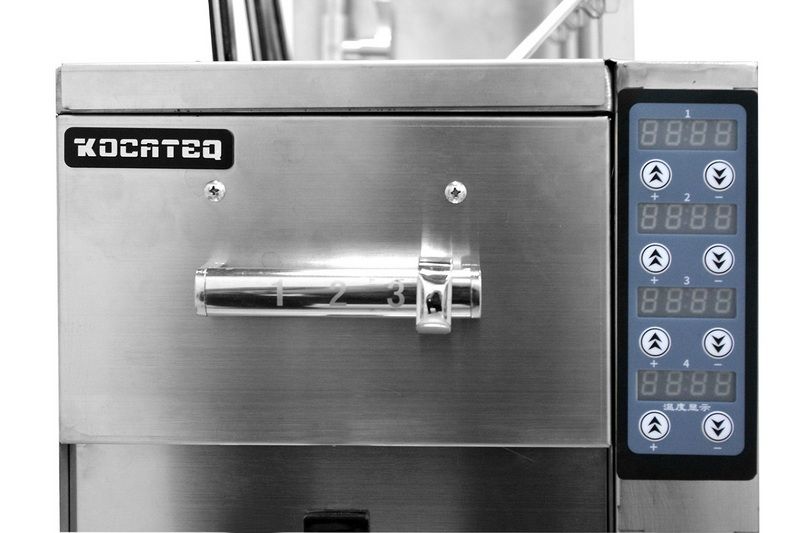 - Автоматическое опускание и поднимание 3 порционных корзин диаметром 13,5 см и глубиной 15 см с термоизолированными ручками и зацепами;