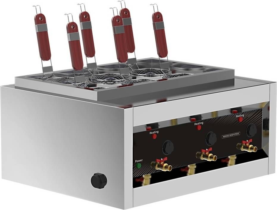 Корпус макароноварки выполнен из нержавеющей стали и имеет прямоугольную форму. Он оборудован тремя варочными ваннами, в которых помещаются шесть круглых корзин. Корзины имеют съемные деревянные ручки. Спереди на корпусе установлены по три сливных крана, регулятора и индикатора нагрева.