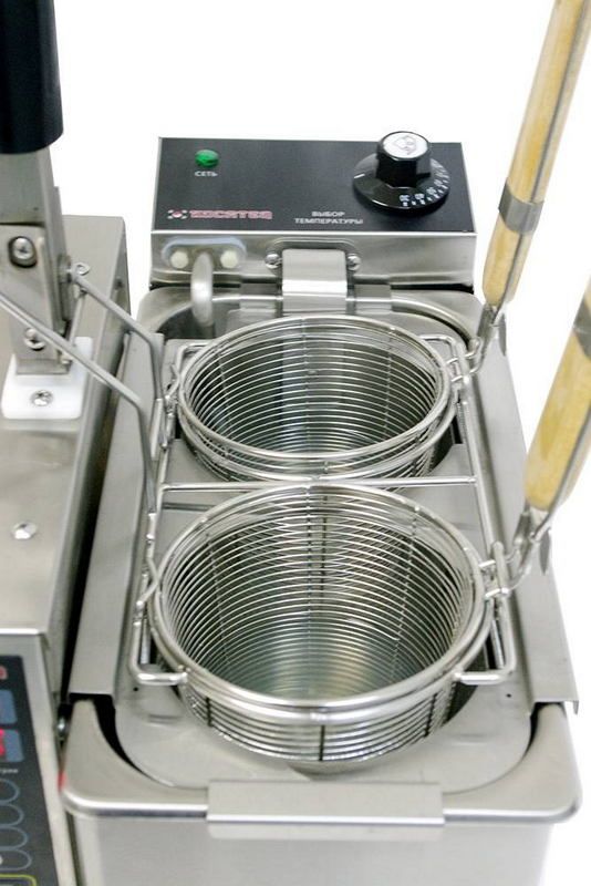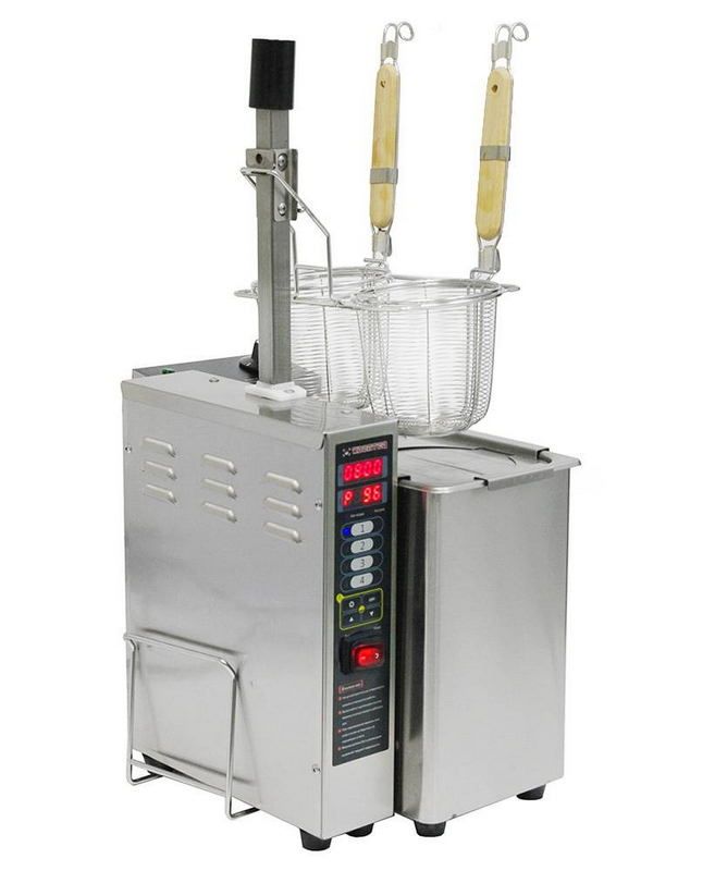 Макароноварка представляет собой прямоугольный корпус из нержавеющей стали, в который встроена емкость для варки и нагревательные элементы. Сверху емкость накрывается защитной панелью с двумя круглыми отверстиями для корзин. При поднятых корзинах отверстия закрываются специальными шторками. Корзины имеют термоизолированные ручки и поднимаются автоматически. Для этого в конструкции предусмотрен отдельный блок автоматического опускания и подъема. На его передней панели располагаются кнопки для программирования контроллера режимов автоматической варки. Для ручного управления температурой предусмотрен термостат, ручка которого находится на торцевой стороне корпуса.