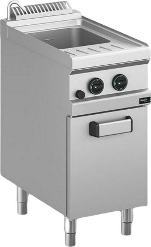 Apach Cook Line APPG-47P/PL 700 серпредставляет собой макароноварку, предназначенную для оснащения пунктов общественного питания, торговых точек. Аппарат отлично подходит для варки пасты, спагетти и прочих макаронных изделий, и блюд из теста. В нижней части установлен шкаф с глухой дверцей. Нагрев осуществляется с помощью двух горелок с пьезоподжигом. Корпус, панель управления, рабочая поверхность, задние и боковые панели изготовлены из стали марки AISI 430. Ванна выполнена из стали AISI 316. Нагревательные элементы также произведены из нержавеющей стали.