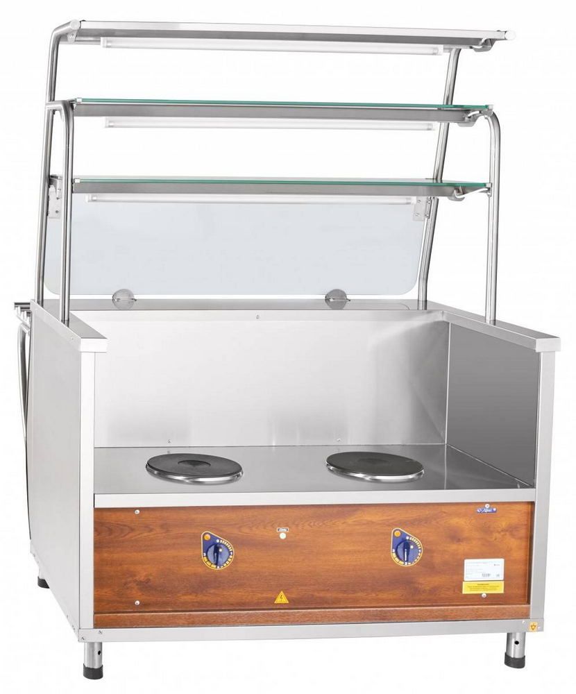 Мармит представляет собой полуоткрытый модуль с двумя встроенными внутри электрическими конфорками. На задней панели для каждой конфорки установлены отдельные регуляторы работы. Спереди мармит оснащен двумя полками с подсветкой и подъемной прозрачной дверцей для выдачи блюд в тарелках. Модуль имеет направляющие для подносов и кашированную под дерево переднюю панель.
