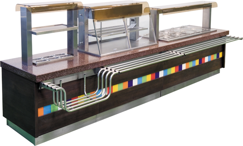 Мармит выполнен в виде стойки, с задней стороны которой предусмотрена столешница для установки трех электросупниц. Для каждого сосуда на задней панели предусмотрено по розетке. При необходимости мармит комплектуется одно- или двухъярусной полкой для размещения готовых блюд в тарелках. На передней стенке крепятся направляющие для продвижения подносов.
