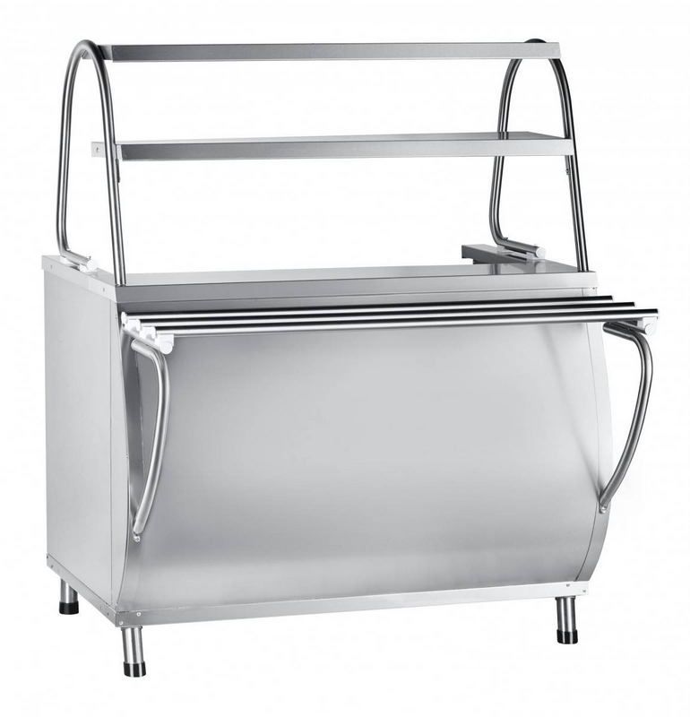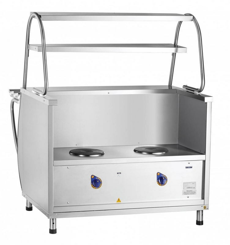 Оснащён 2 конфорками. Имеет двухъярусную полку для выкладки порционных блюд и регулируемые по высоте ножки. Передняя стенка и панель управления выполнены из нержавеющей стали. Оборудование может использоваться как отдельно, так и в составе линий раздачи.