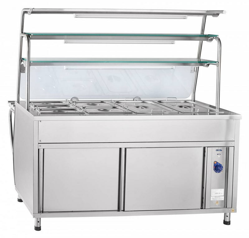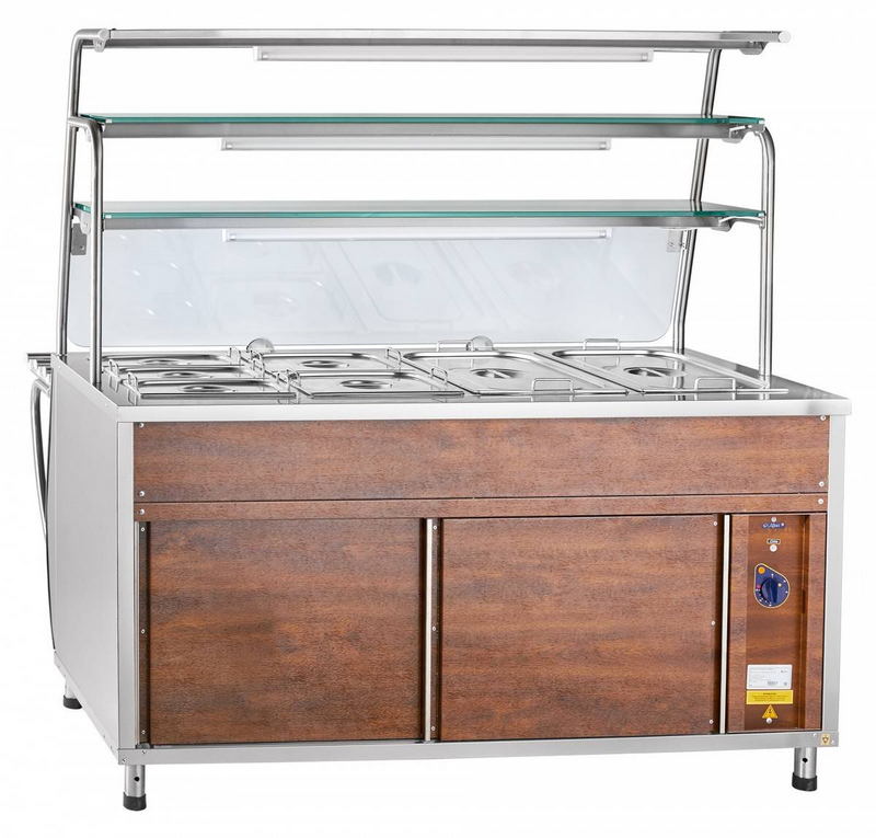 Над ванной установлены две полки с подсветкой для хранения блюд в тарелках и прозрачная подъемная дверца для выдачи пищи. Мармит снабжен направляющими для подносов. Передняя и задняя панели кашированы под дерево.