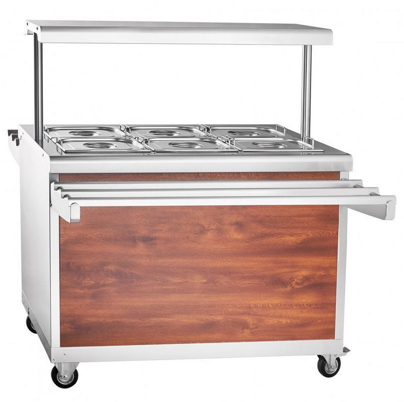 Мармит представляет собой закрытый модуль из нержавеющей стали. Сверху в нем установлена паровая ванна для нагрева вторых блюд в гастроемкостях. Под ней находятся закрытые шкафы со сдвижными дверцами для посуды и инвентаря. Там же расположена панель с регулятором мощности нагрева.