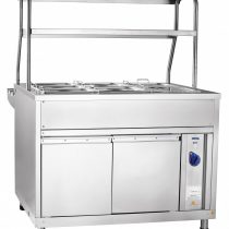 Мармит представляет собой прямоугольный стальной нержавеющий корпус, установленный на регулируемые ножки. Его боковые и передняя стенки сплошные, задняя состоит из панели управления и двух распашных дверок нейтрального шкафа. Сверху расположена ванна с двумя нагревательными элементами, в которой из воды образуется пар. Над ванной установлена столешница с ячейками для нескольких гастроемкостей с блюдами, которые и разогреваются паром. Над столешницей на кронштейнах прикреплены две полки для тарелок с вторыми блюдами. Одна из полок снабжена подсветкой содержимого гастроемкостей. Мармит спереди имеет направляющие на кронштейнах для подносов.