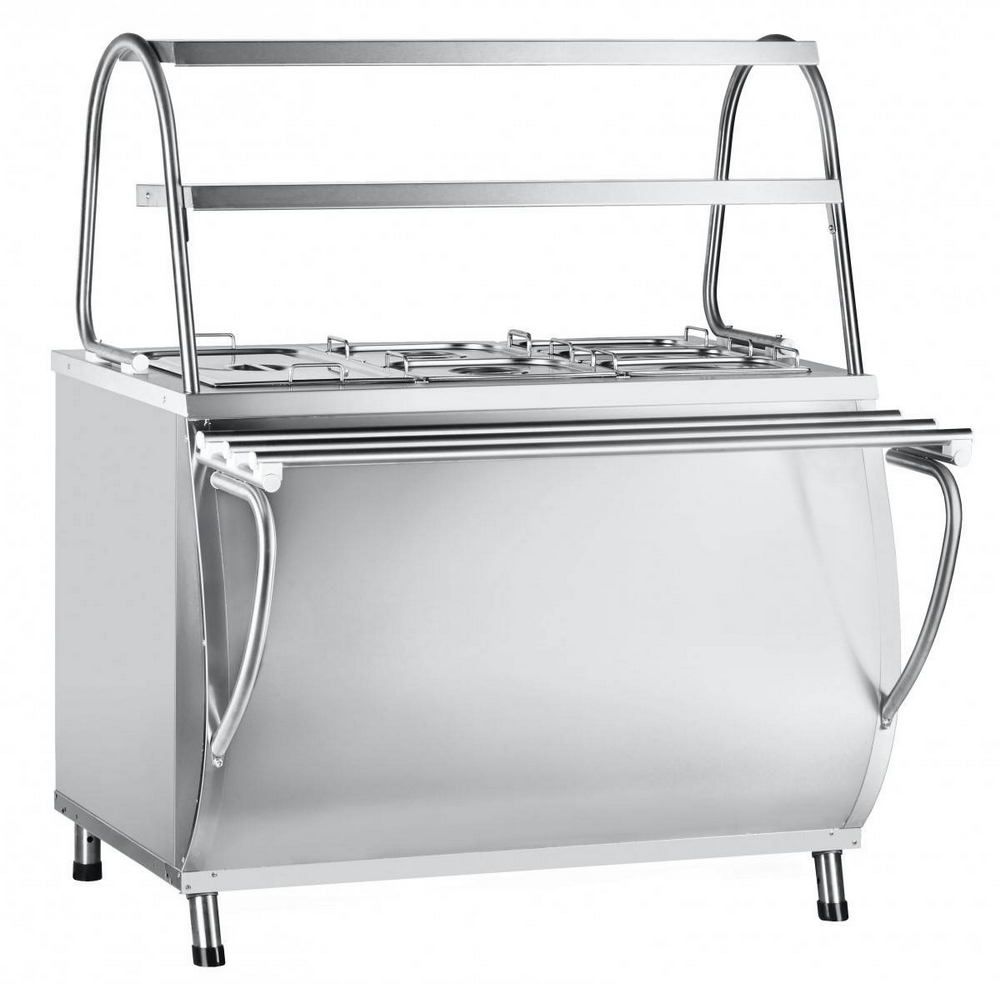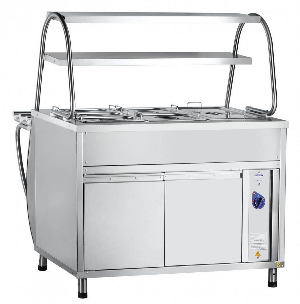 Оснащён паровой ванной с набором гастроёмкостей для вторых блюд. Имеет двухъярусную полку для выкладки порционных блюд и регулируемые по высоте ножки. Оборудование может использоваться как отдельно, так и в составе линий раздачи.