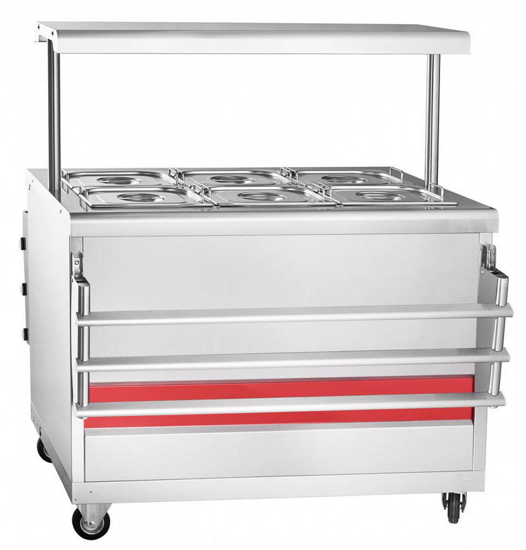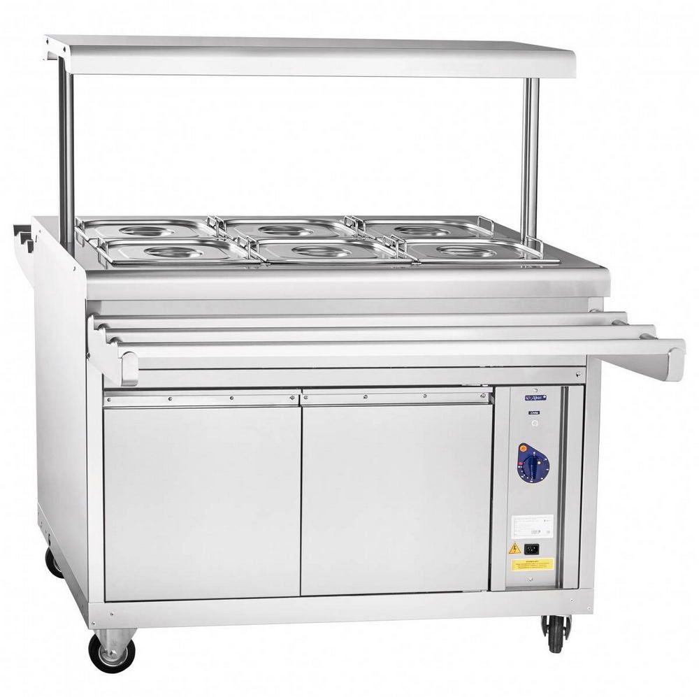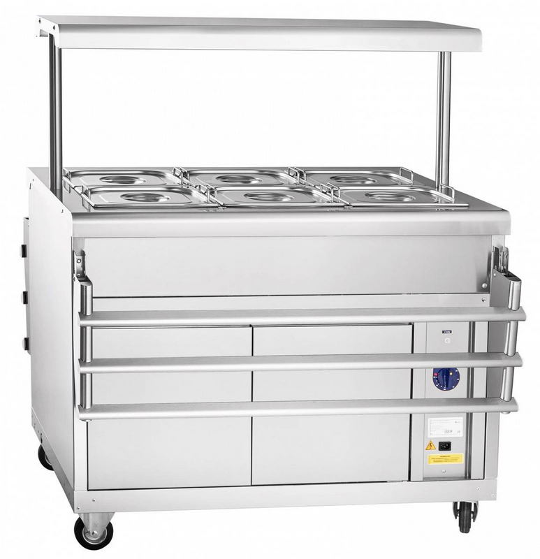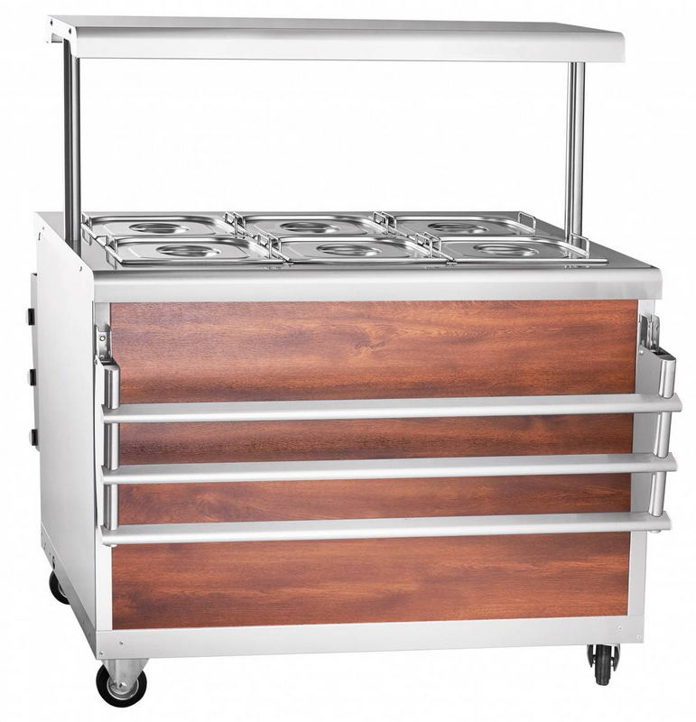 Мармит представляет собой закрытый модуль из нержавеющей стали. Сверху в нем установлена паровая ванна для нагрева вторых блюд в гастроемкостях. Под ней находятся закрытые шкафы со сдвижными дверцами для посуды и инвентаря. Там же расположена панель с регулятором мощности нагрева.