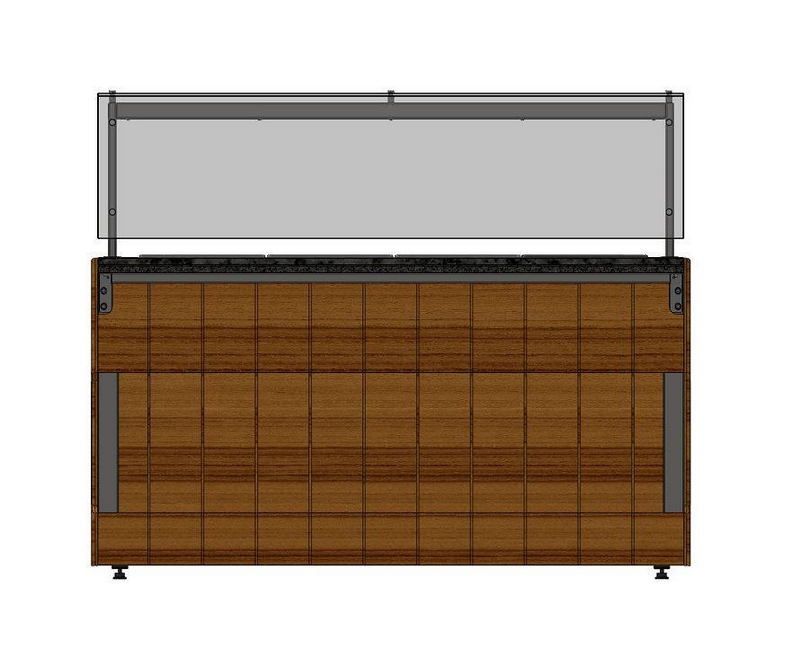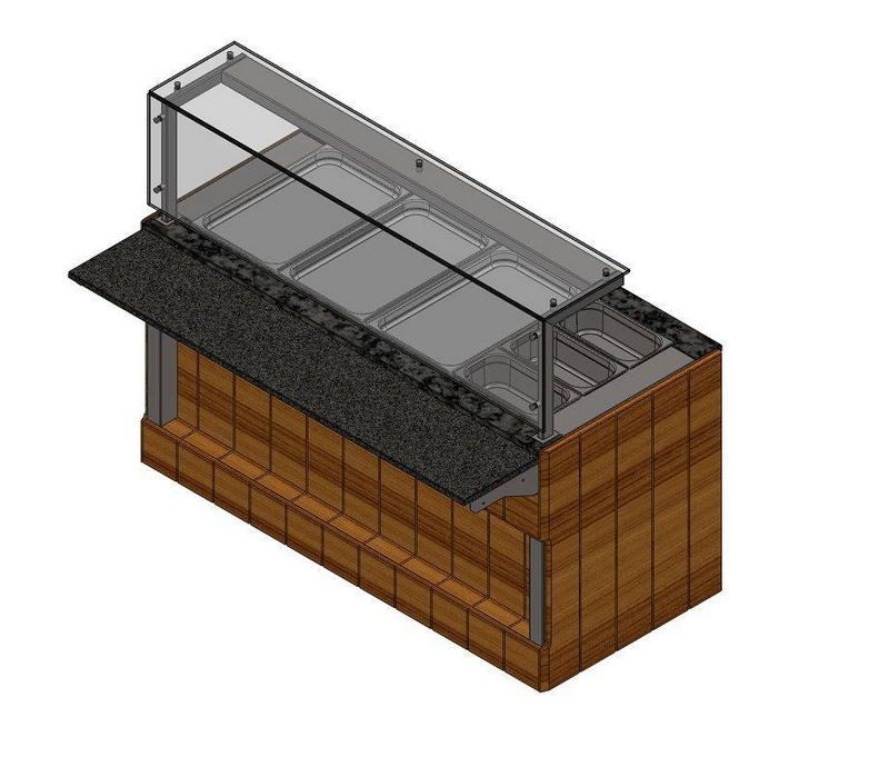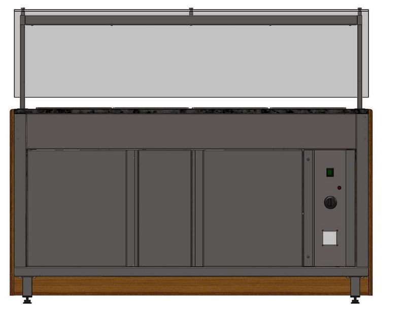 - Прилавок может быть дополнительно оборудован плафоном с инфракрасным нагревом. Инфракрасный нагреватель устанавливается под стеклянной полкой, настроен на поддержание температуры около +60 °С на поверхности столешницы;