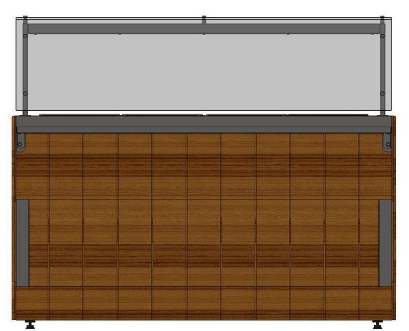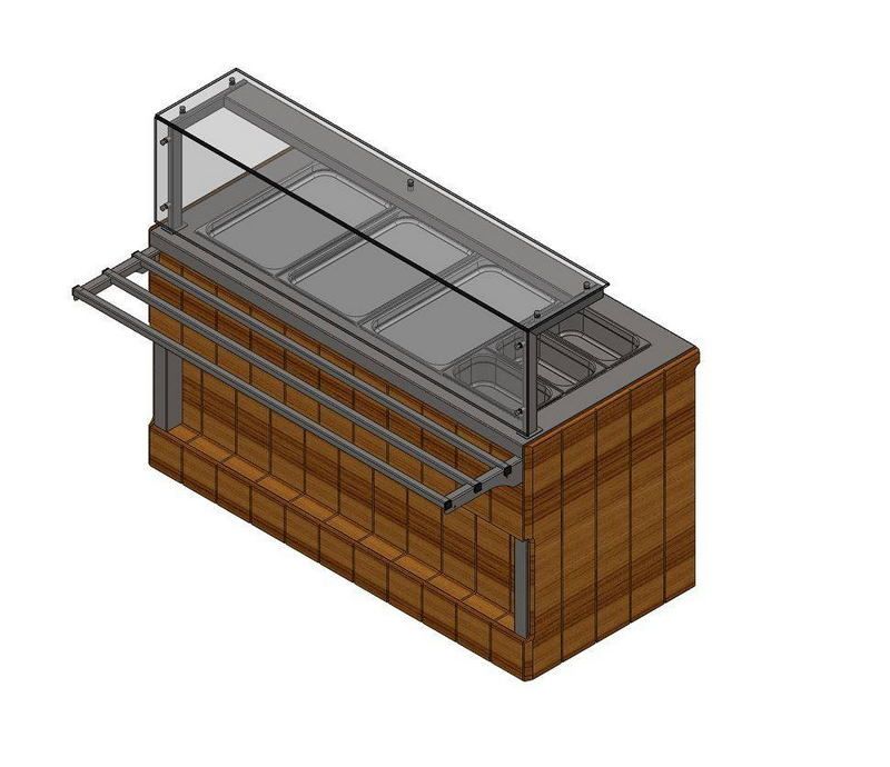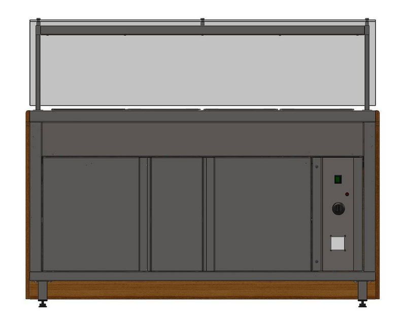 - Прилавок может быть дополнительно оборудован плафоном с инфракрасным нагревом. Инфракрасный нагреватель устанавливается под стеклянной полкой, настроен на поддержание температуры около +60 °С на поверхности столешницы;