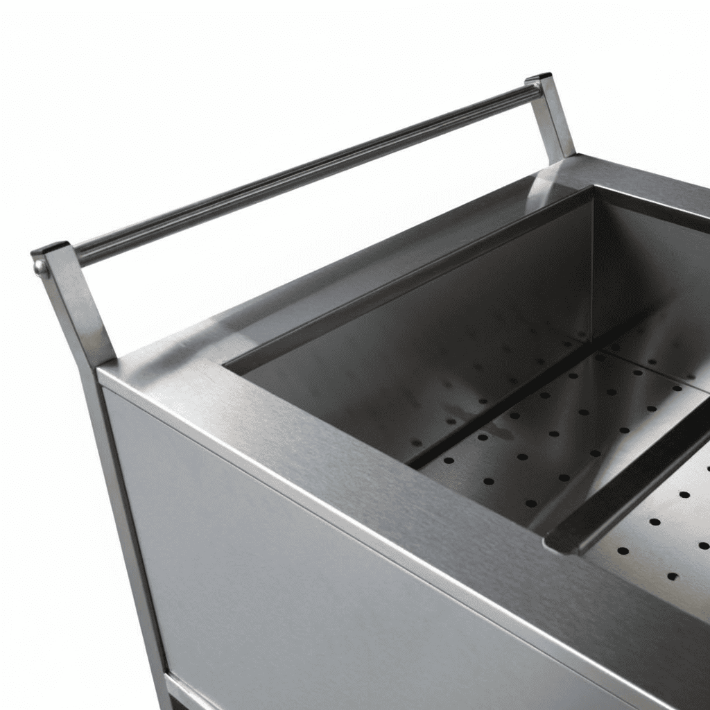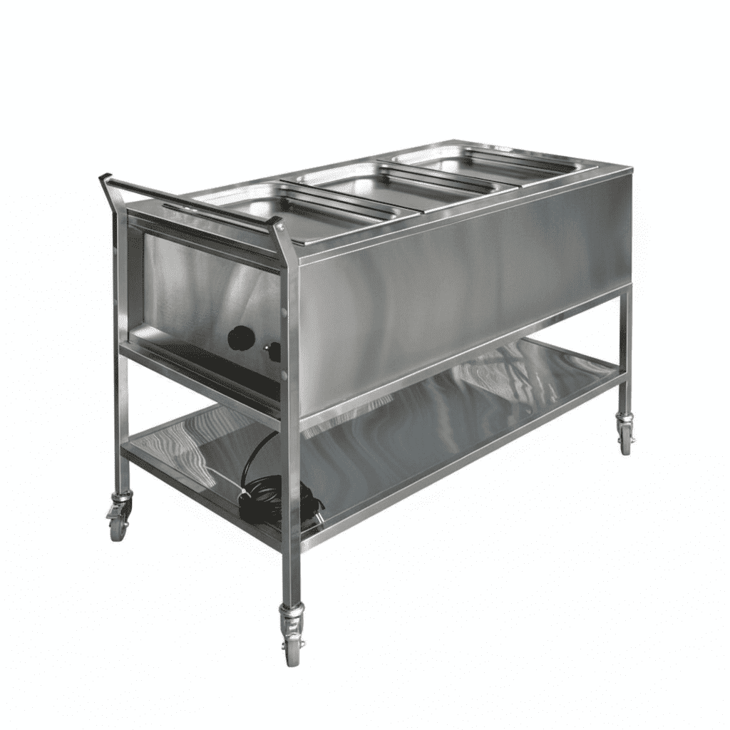 Корпус выполнен из нержавеющей стали. Изделие имеет четыре колесные опоры, две из которых с тормозным механизмом. Предусмотрена возможность использования специальных гастроемкостей стандартных размеров (GN 1/1, GN 1/2, GN 1/3).