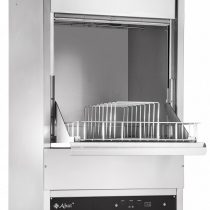 Корпус машины имеет прямоугольную форму, выполнен из нержавеющей стали и установлен на регулируемые ножки. Из того же материала изготовлены все элементы, контактирующие с водой. В верхней части корпуса находится моечная камера с выкатной тележкой для посуды, моющими и ополаскивающими разбрызгивателями. Камера снабжена двумя одновременно открывающимися дверями: верхней подъемной и нижней откидной. На передней панели корпуса под дверью расположен кнопочный электронный блок управления, отображающий информацию о программе мойки, времени и температуре. Под камерой установлена ванна для воды с фильтром и корзинкой для остатков пищи. Под ванной и за ней находятся рабочие узлы и агрегаты (насосы, бойлер, дозаторы, фильтры, датчики, шланги, электрооборудование).