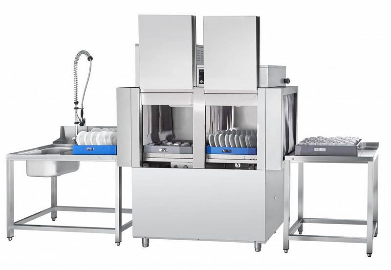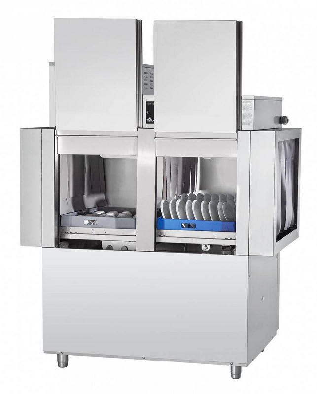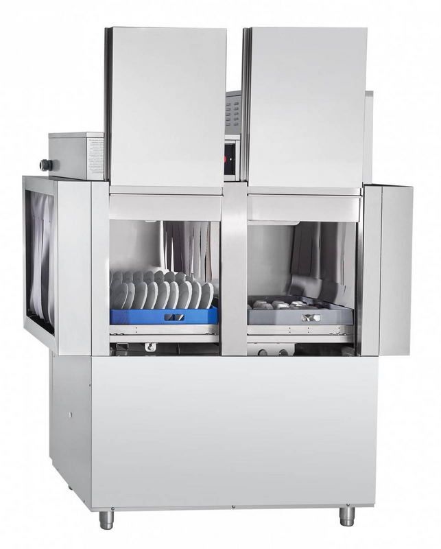 Корпус машины имеет прямоугольные формы и, как и все контактирующие с водой элементы, изготовлен из нержавеющей стали. На его передней стороне расположены две сдвижные дверцы для технического обслуживания внутренних узлов. Моечная камера расположена в верхней части корпуса, в ней установлены направляющие для движения кассет с посудой и распылители для мытья и ополаскивания. Кассеты попадают в камеру и выходят из нее через отверстия со шторками. Под камерой расположена моечная ванна с ТЕНом и основные элементы конструкции (бойлер, насос, дозаторы, электромагнитные клапаны, термоограничители, датчики, шланги водоснабжения и слива и др. узлы). На крыше корпуса установлен теплообменник, снижающий расходы на нагрев воды. Там же находится монтажный щит и панель управления с кнопками и индикаторами. Машина стоит на регулируемых по высоте ножках.