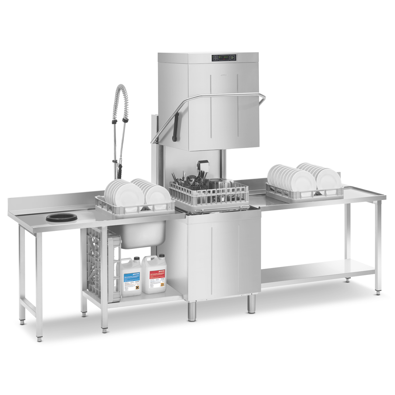 Машина посудомоечная купольная SMEG EASYLINE SPH515Hиспользуется на предприятиях общественного питания и торговли для мойки столовых приборов, тарелок, стаканов, чашек и другой посуды.